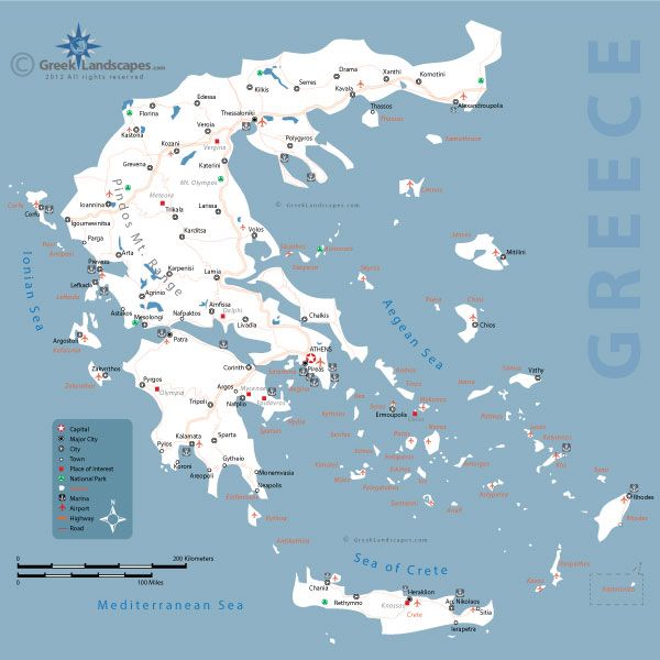 Греческие острова, которых насчитывается около 1400, рассеяны вокруг материкового побережья страны и расположены в каждом из морей, омывающих Грецию.