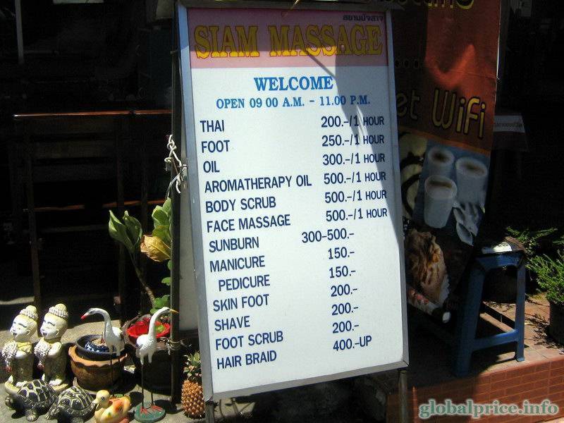 Стоимость: массаж стоит от 200 бат (7 долларов) в час, за тайский массаж до 500 бат (18 долларов) за скраб-массаж для тела.