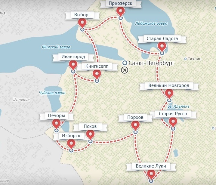 Владимир — Боголюбово — Суздаль — Иваново — Кострома — Ярославль — Ростов Великий — Переславль-Залесский — Сергиев Посад — Александров — Углич — Мышкин — Мартыново — Борисоглебский