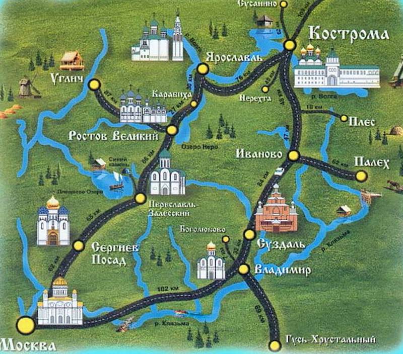 Владимир — Боголюбово — Суздаль — Иваново — Кострома — Ярославль — Ростов Великий — Переславль-Залесский — Сергиев Посад — Александров