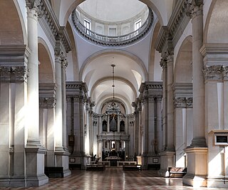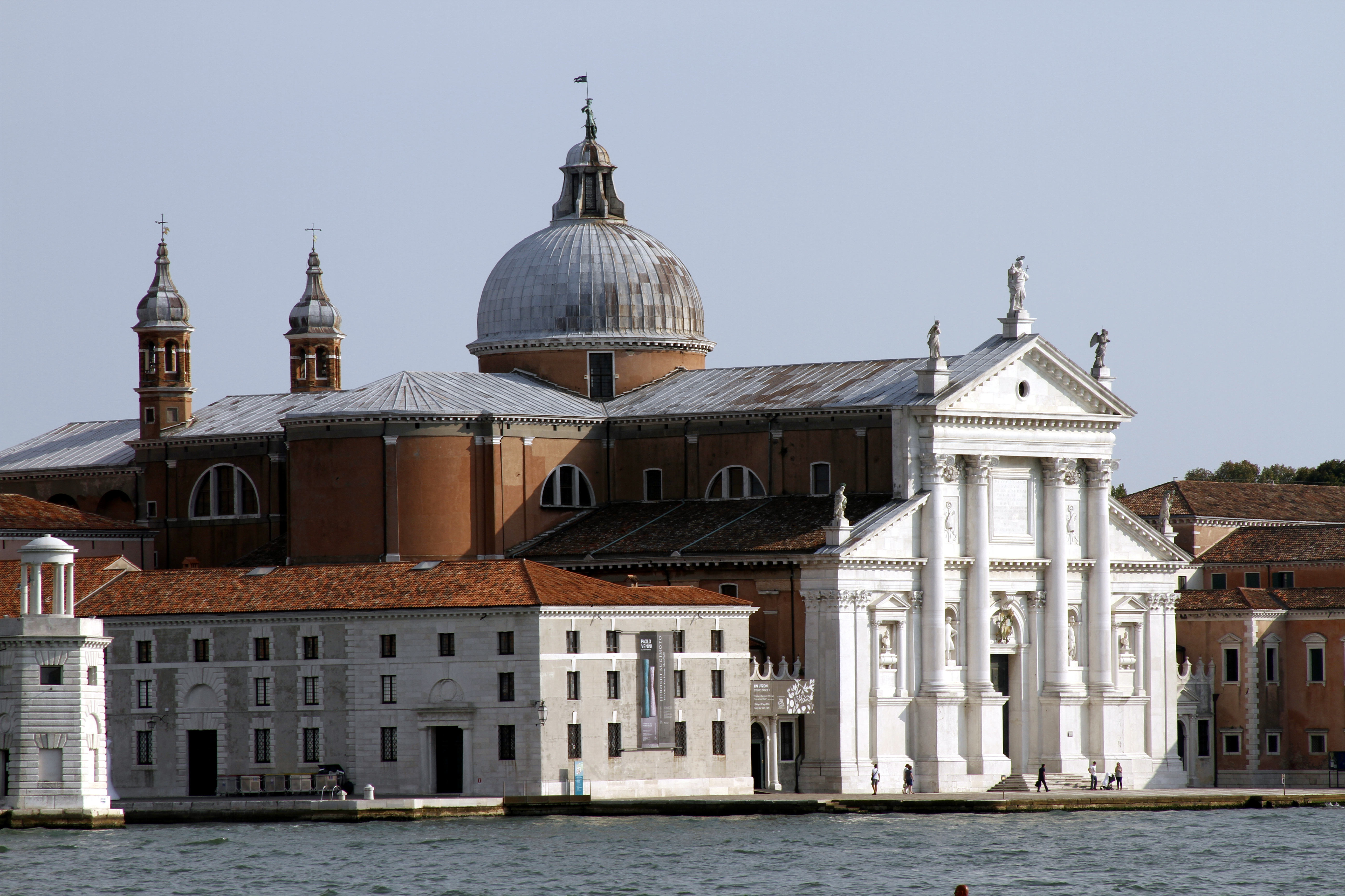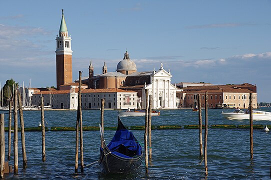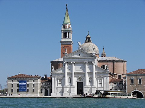 | Сан Джорджио Маджоре — бенедиктинская церковь XVI века на одноименном острове в Венеции , северная Италия, спроектированная Андреа Палладио и построенная между 1566 и 1610 . Церковь представляет собой базилику в классическом стиле ренессанс и ее блестящий белый мрамор сияет над голубой водой лагуны.Палладио прибыл в Венецию в 1560 году, когда трапезная монастыря был перестроен. Он значительно усовершенствовал это и в 1565 г. попросили подготовить модель новой церкви. Модель была завершена и утвержден в 1566 году, и первый камень был заложен в присутствии Папа Римский в том же году. Работа не была закончена до смерти Палладио в 1580 году, но корпус церкви был завершен к 1575 году, кроме хора за алтарем и фасадом. Украшение интерьер был завершен впоследствии. Ослепительно белый фасад представляет собой решение Палладио проблемы адаптации фасада классического храма к форме христианской церкви с ее высоким нефом и низкими боковыми проходами, что всегда было проблемой. Решение Палладио наложило на два фасада, один с широким фронтоном и архитравом, простирающимся над нефом и
