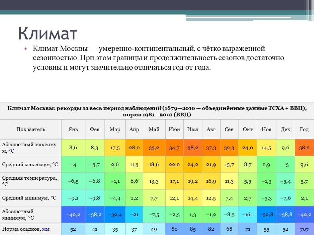 | Средний температура (°C) | минимум температура (°C) | максимум температура (°C) | Норма осадков (мм) | Влажность (%) | Дождливые дни (Д) | долгота дня (часы) | |
