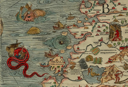 Помимо изображения мест и людей, на старинной карте отображены сюжеты классических греческих и римских мифов, ряда самых популярных легенд и некоторых библейских рассказов. Геркулесовы столбы с надписью «Ne plus ultra» – «ничего дальше» у входа в Гибралтарский пролив обозначают конец заселённых людьми земель. В правом верхнем углу находятся образы из Ветхого Завета – Адам и Ева, Ноев ковчег и Вавилонская башня. На острове Крит расположился Кносский лабиринт из греческой мифологии, построенный легендарным изобретателем Дедалом для заключения Минотавра.