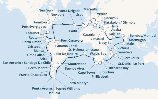 Судно совершает рейсы в Северную Европу, В Южную и Северную Америку, в страны Карибского бассейна, на побережье Африки, в Средиземное море, в Индийский океан и Персидский залив. Стоимость тура в Испанию составляет 449 долларов на одного человека.