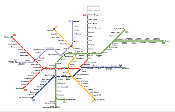 Миланский метрополитен (Metropolitana di Milano) — начал свою работу в 1964 году. На сегодняшний день он состоит из 94 станций и имеет 3 соединяющие их линии (М1-linea rossa (красная), М2 -linea verde (зеленая), М3-linea gialla (желтая)) Большинство станций подземные, но есть и наземные их порядка десяти. 11 станций метро являются станциями пересадки на пригородный железнодорожный транспорт(Servizio ferroviario suburbano di Milano)Протяженность путей миланского метрополитена 83,3 километра.