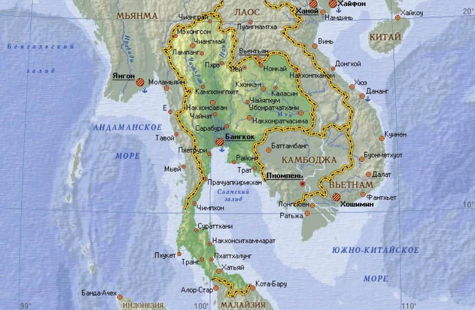 Малайзия и Сингапур на юге, Мьянма на востоке. Северные части Мьянмы и Лаоса составляют прямую северную границу Таиланда.Таиланд — страна на азиатском континенте, состоящая из множества островов и большого материка. Столица Таиланда Бангкок находится не на тайских островах, а на материке на юге, у Сиамского залива.