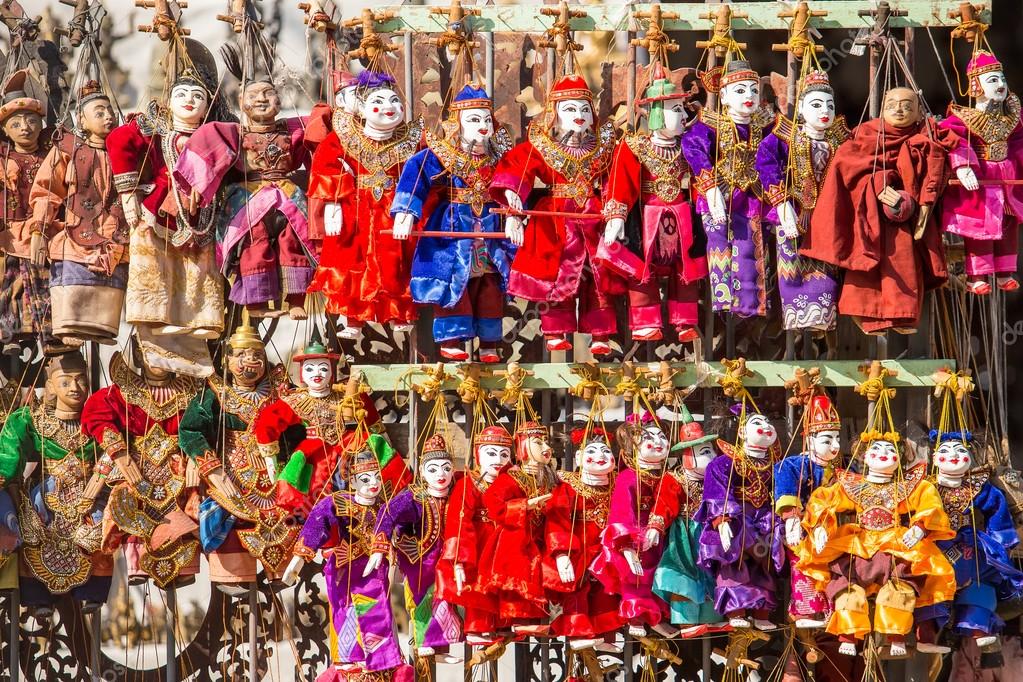 - Куклы-марионетки – еще один популярный сувенир Мьянмы. Тела и лица кукол сшиты и расписаны вручную, одежду украшают вышивки. Размер их может достигать 80 см и считается, что у каждой куклы свой характер.
