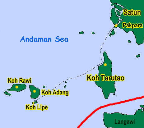 Национальный парк Тарутао (Tarutao) расположен на самом юге Таиланда, на границе с Малайзией. В состав национального парка входит 51 остров, в том числе, всем известный остров Липе. Национальный парк занимает достаточно большую территорию, и его острова очевидным образом делятся на две большие группы. В первую группу островов входят остров Тарутао и несколько мелких островов, все они расположены в 20-ти км. от береговой линии материка. Из этой группы островов интерес представляет, в первую очередь, сам остров Тарутао, самый крупный остров национального парка, примечательный своими многокилометровыми пустынными пляжами и роскошным тропическим лесом, занимающим практически всю территорию острова. Во вторую группу островов входят острова архипелага Аданг, включая остров Липе, крупные острова Аданг и Рави, и несколько десятков островов размером поменьше. Острова эти компактно расположены на расстоянии приблизительно 70 км. от береговой линии материка, а от острова Тарутао их отделяет расстояние около 40 км. Интересных островов в составе архипелага Аданг много, и о них написана отдельная статья: Архипелаг Аданг и соседние острова. Кроме этих двух групп островов, особого упоминания заслуживает отдельно стоящий остров Кай (Koh Khai), находящийся ровно на полпути между островами Тарутао и Аданг. Главной достопримечательностью острова Кай является необычная каменная арка, расположенная посреди белоснежного пляжа, и считающаяся полуофициальным символом национального парка Тарутао. Поездки на острова национального парка Тарутао. Карты островов и национального парка.