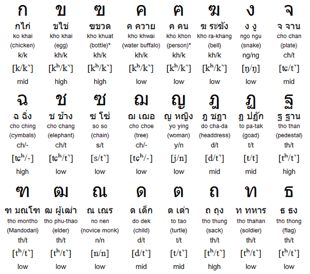 Отыщите буквы, вам уже знакомые, посмотрите, много ли почти одинаковых буквы, удивитесь тому факту, что многие буквы обозначают одинаковые звуки… Ведь выходит, что согласных звуков в тайском раза в два+ меньше, чем согласных букв…