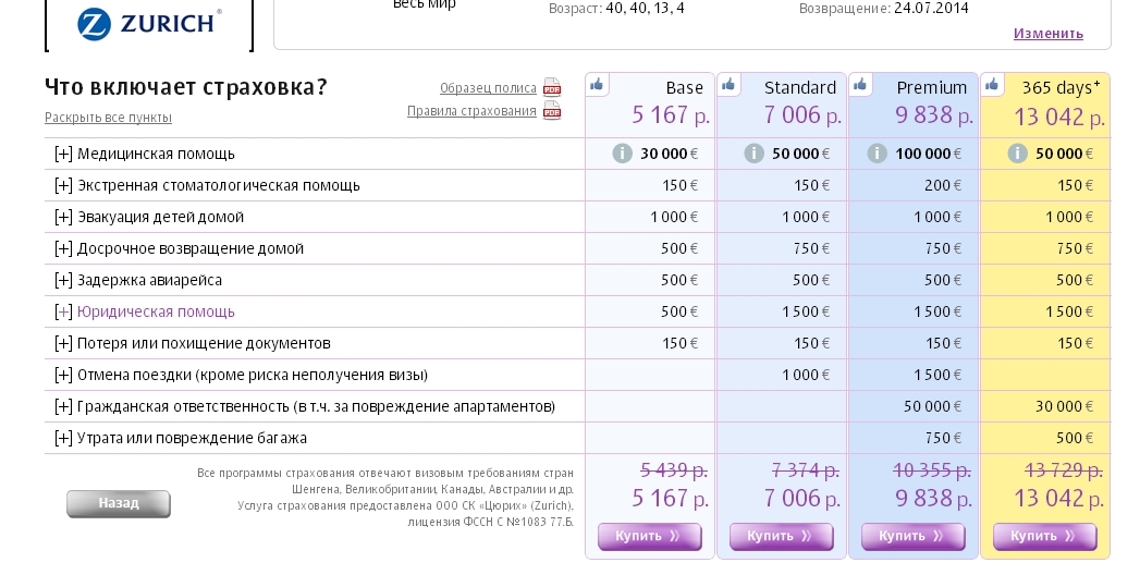 Даже при покупке через форму, клиент попадает на сайт Tripinsurance. Здесь можно выбрать один из трех тарифов: Base, Standart, Million