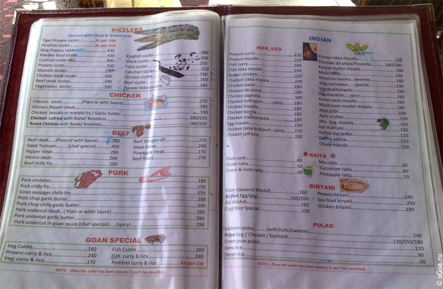 Что попробовать на Гоа из еды? В меню индийских шейков, как правило, не менее двух сотен позиций: овощные салаты и супы, обязательно индийская национальная кухня, блюда из тандури, морепродукты, соусы, приправы. Выбор широкий, а цены — низкие.