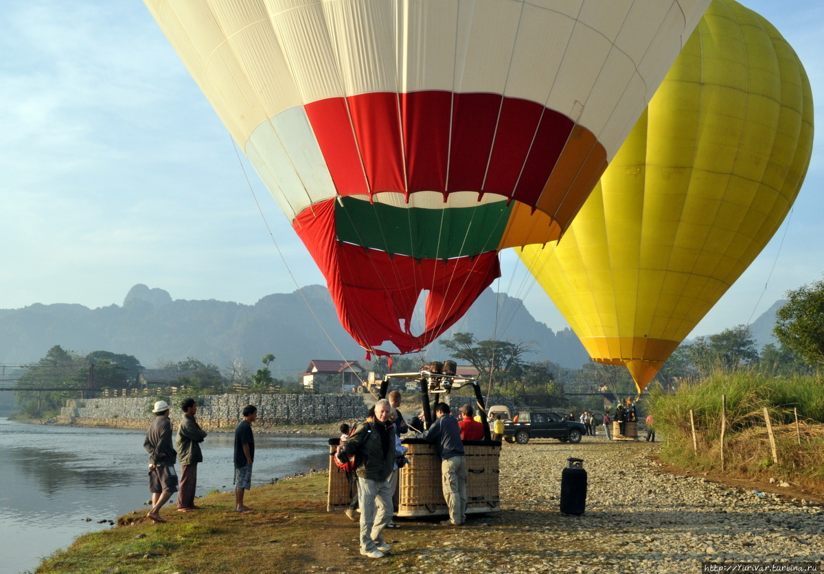 Во Ванг Вьенге совсем недорого стоит полет на воздушном шаре. Мы уже поднимались на воздушном шаре в Сием Рипе над храмовым комплексом Анкор Ват. Только там шар был привязан к земле и сам процесс занял от силы 15 минут.