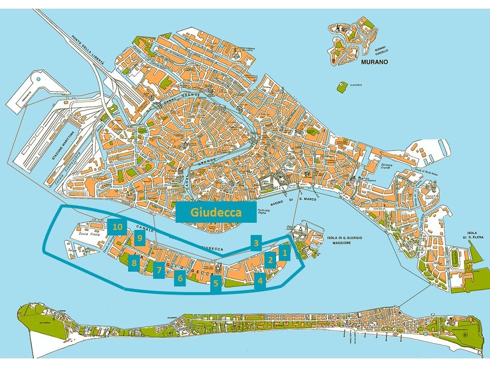 - 2— более скоростной маршрут (25 минут против 45 минут по Гранд Каналу от №1) с меньшим количеством остановок между P.le Roma и San Marco. Минус в том, что обратно на автовокзал идет не по Гранд Каналу, а мимо острова Guidecca.