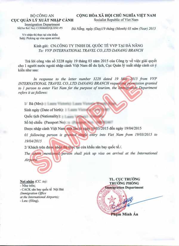 — и самое главное – Приглашение (оно же визовая поддержка, оно же Approval Letter). Это письмо на официальном бланке Иммиграционного департамента Вьетнама, разрешающее въезд в страну целому списку туристов и путешественников. Выглядит Приглашение так.Часто это многостраничный документ с красной печатью на каждой странице. Где-то обязательно будет ваша фамилия. Приглашение вы получите по электронной почте, ниже мы расскажем, как. Распечатайте на обычном черно-белом принтере главную страницу и ту страницу, где найдете свои данные – выделите их цветным маркером, чтобы пограничнику было проще найти вас в списке.