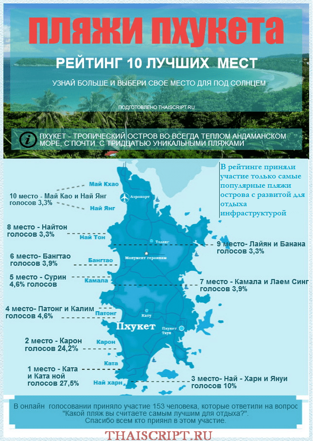 Самый популярный пляж на Пхукете — (Patong), многие его сравнивают с Паттайей, так как там самое тусовочное место на острове: ночная жизнь, клубы, бары, торговые центры, множество людей. Поэтому, если нужны тишина и спокойствие, то туда ехать точно не стоит, не рекомендую. За семейный и спокойным отдыхом, либо на деревенский (Bang Tao), либо на . А если нужно что-то что-то среднее, то на или . Как вариант, можно выбрать , но он недалеко ушел от Патонга, там тоже полно людей, хотя движухи поменьше.