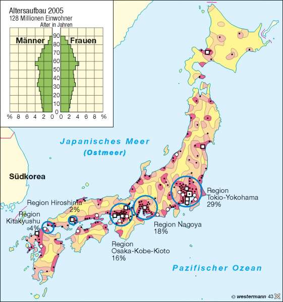 Города Японии с численностью населения более 1 000 000 человек занимают площадь в 6,372 км2. В 10 крупнейших городских округах проживает 25% населения страны. В них располагаются штаб-квартиры международных банков и транснациональных корпораций. Эти города являются административными центрами японских префектур и важнейшими транспортными узлами.