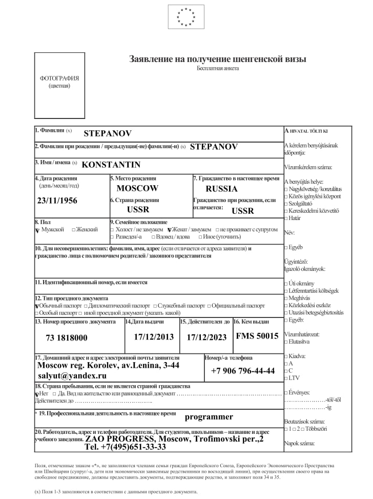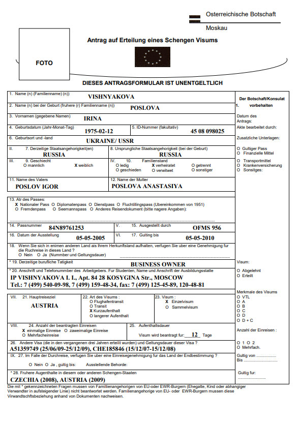 - Анкета. Скачать опросный бланк можно самостоятельно на сайте посольства. Язык заполнения — русский или немецкий. Формат заполнения — на компьютере или от руки. Главное, чтобы текст был разборчивым и легко читаемым. Помарки и исправления недопустимы. Наличие пустых граф — повод для отказа без объяснения причин. Личная подпись заявителя в нужных местах — обязательное требование. Отметки третьих лиц во внимание не принимаются.